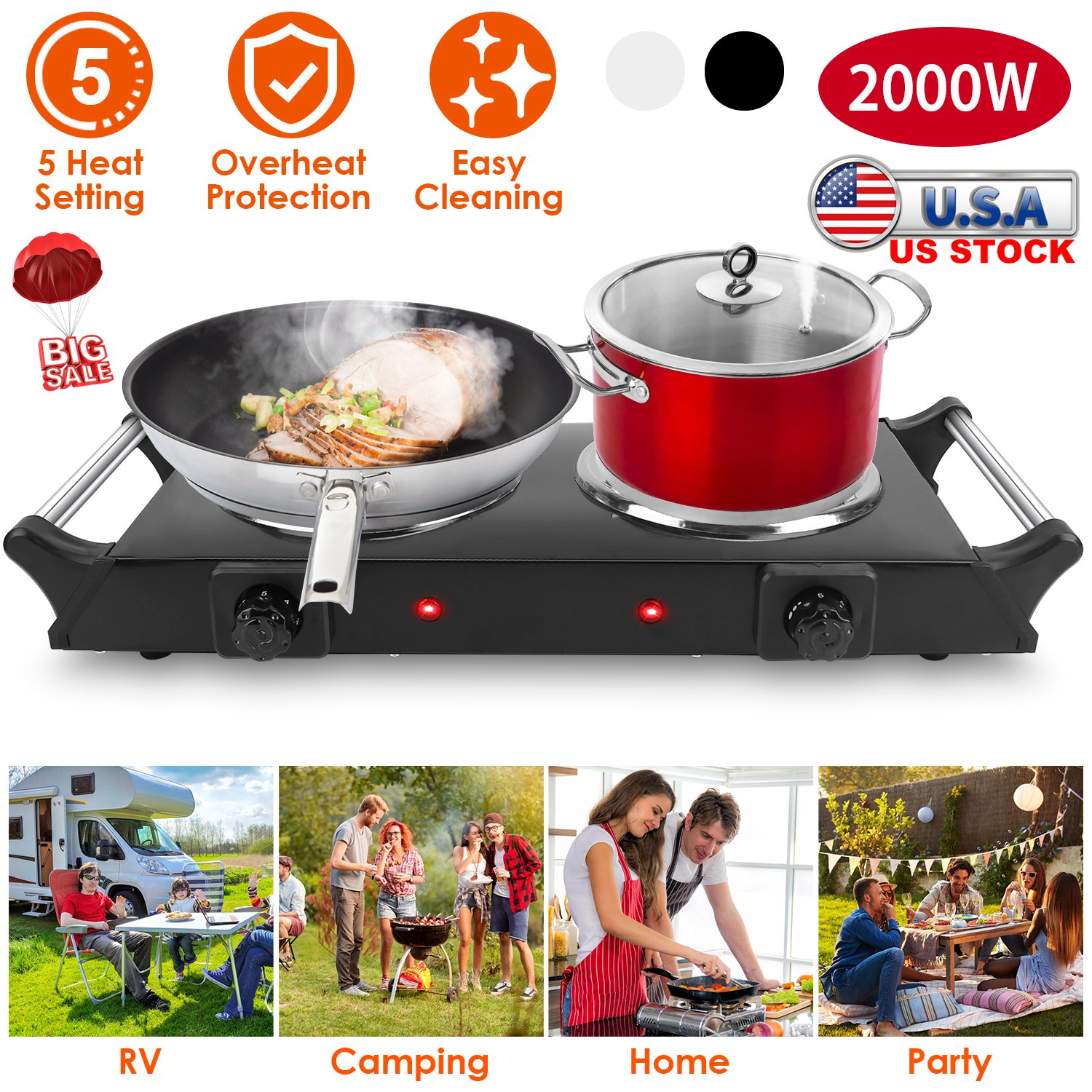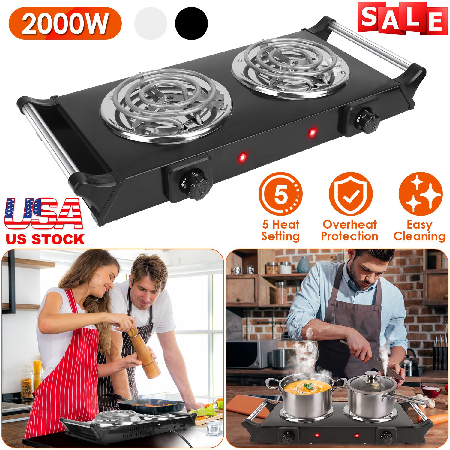 Home > 2000W Electric Dual Burner Portable Coil Heating Hot Plate Stove Countertop RV Hotplate with 5 Temperature Adjustments Portable Handles