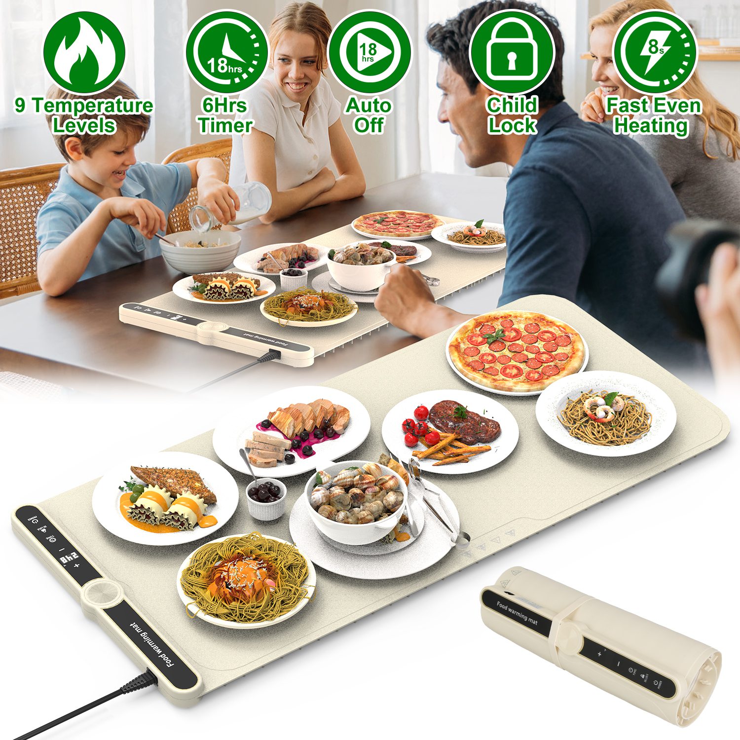 Keep dishes serving-hot with a flexible warming mat. Features 9 temp levels, 6-hour timer, child lock, and auto shut-off—perfect for buffets and parties.