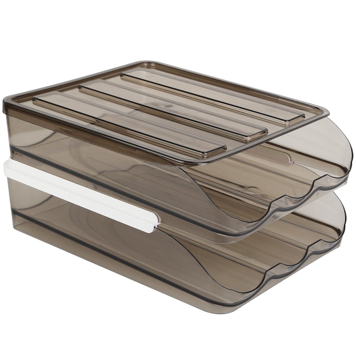Double-layer rolling egg container holds up to 36 eggs. 7° slope auto-dispenses, clear lid, stackable, perfect for fridge organization and kitchen storage.