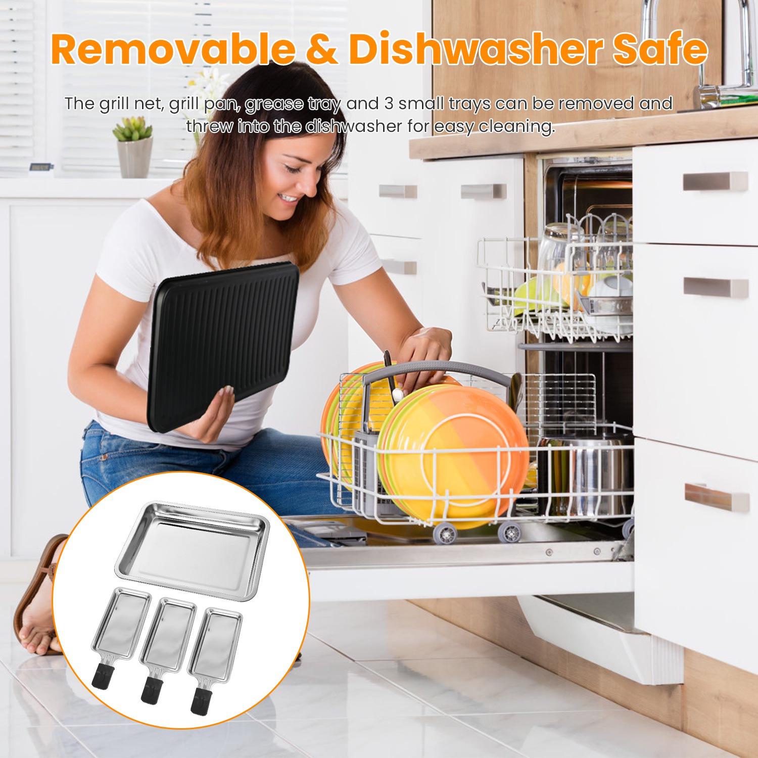 ✅ Easy Clean – Removable plate/net, grease tray, 3 trays are dishwasher-safe.