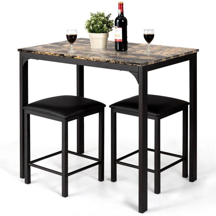 A sleek, small-space solution: faux-marble tabletop with black frame and two padded PU stools that tuck neatly underneath when not in use. Perfect for apartments, breakfast nooks, or studio dining with easy assembly and wipe-clean care.