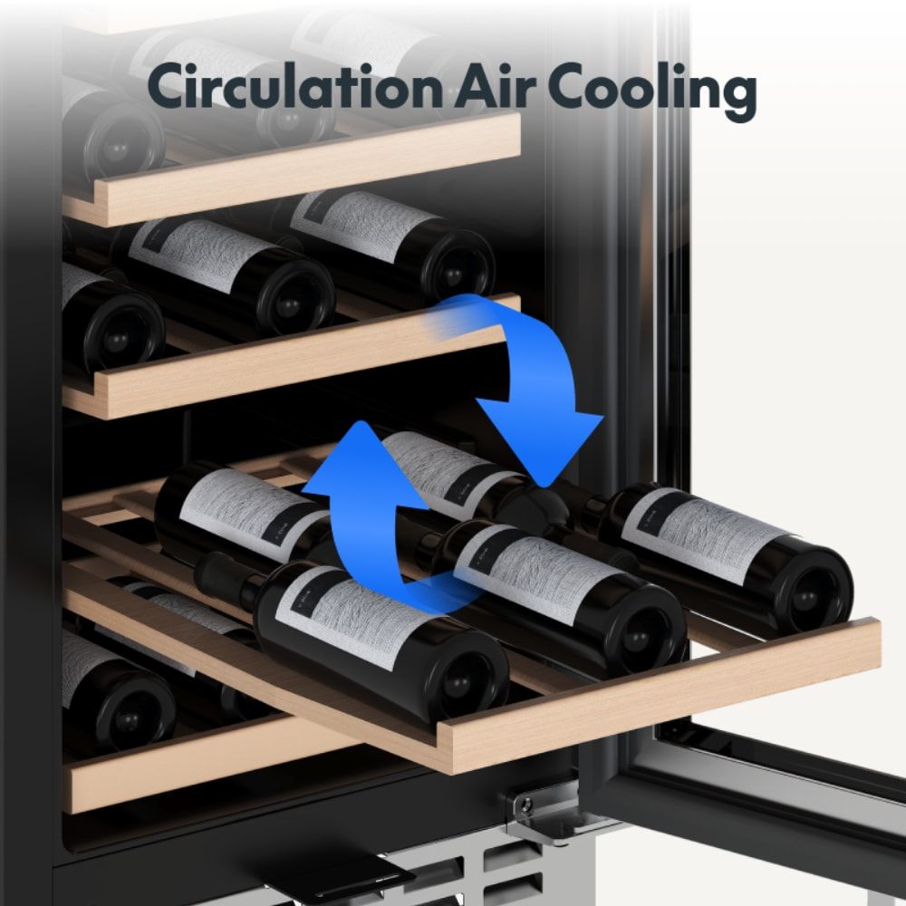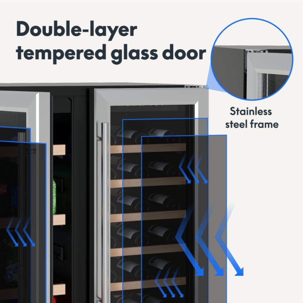 Dual-zone cooler: Left 35–50°F for beverages; Right 41–64°F for wines. Quiet compressor, touch controls, blue LED, double-tempered glass, soft-close doors, lock.