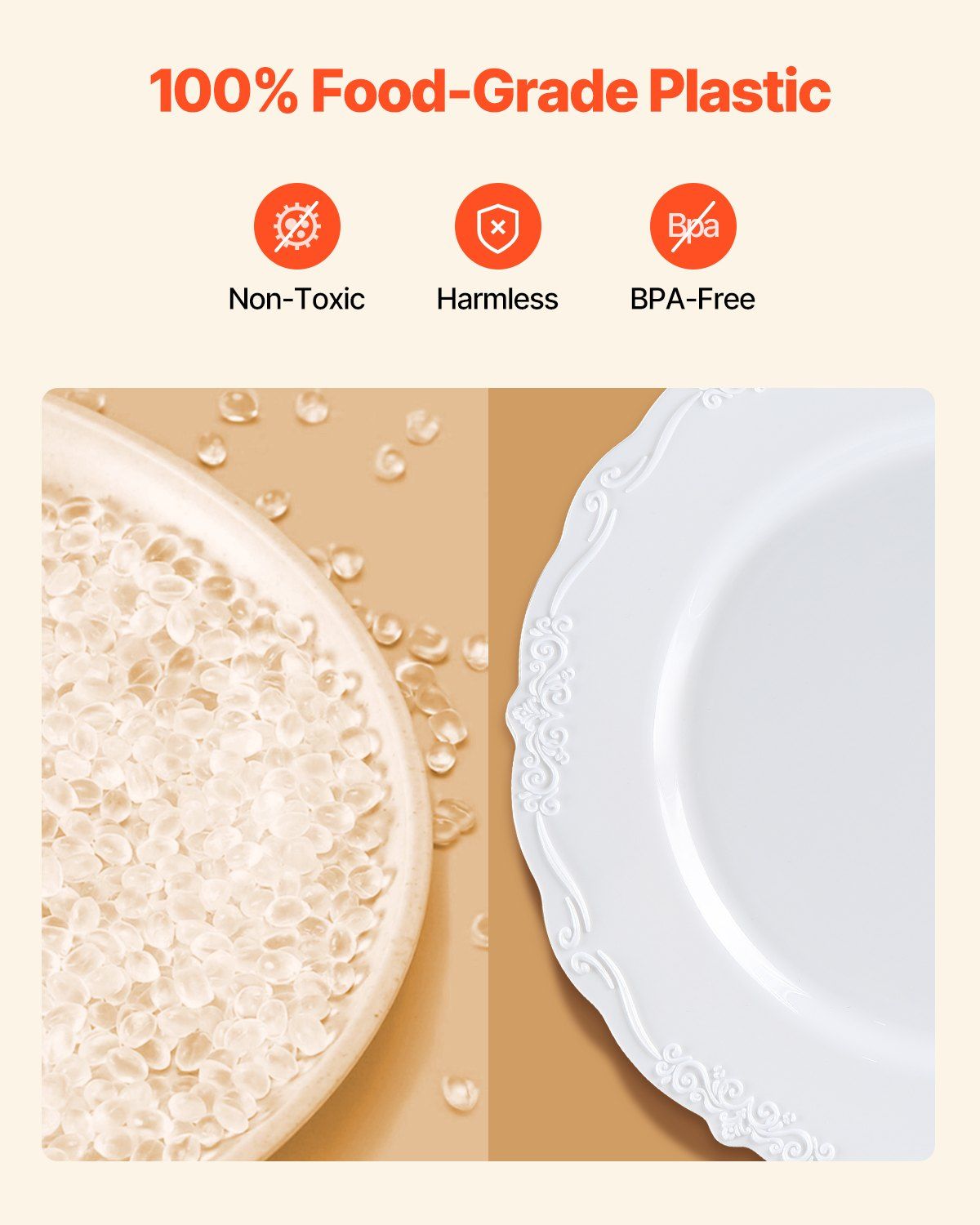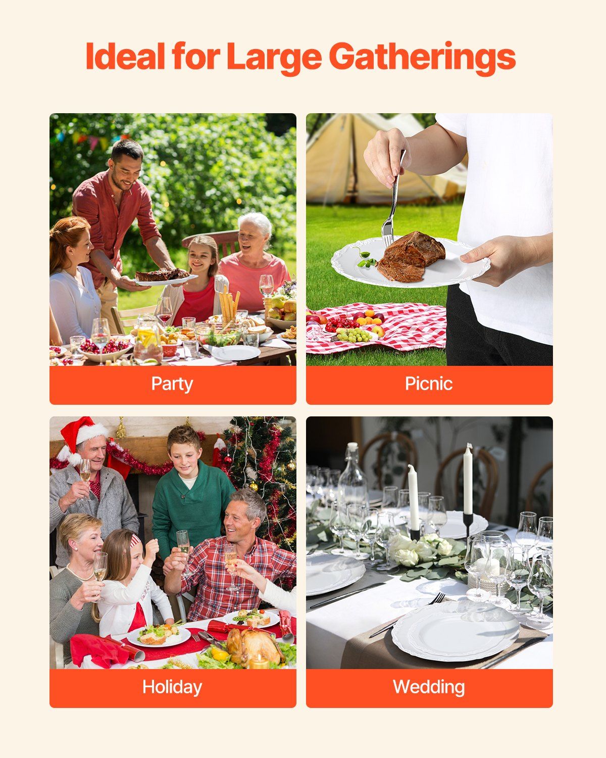 Serve 50 guests with 50 dinner + 50 dessert plates. BPA-free with a refined, porcelain-like look for easy cleanups.