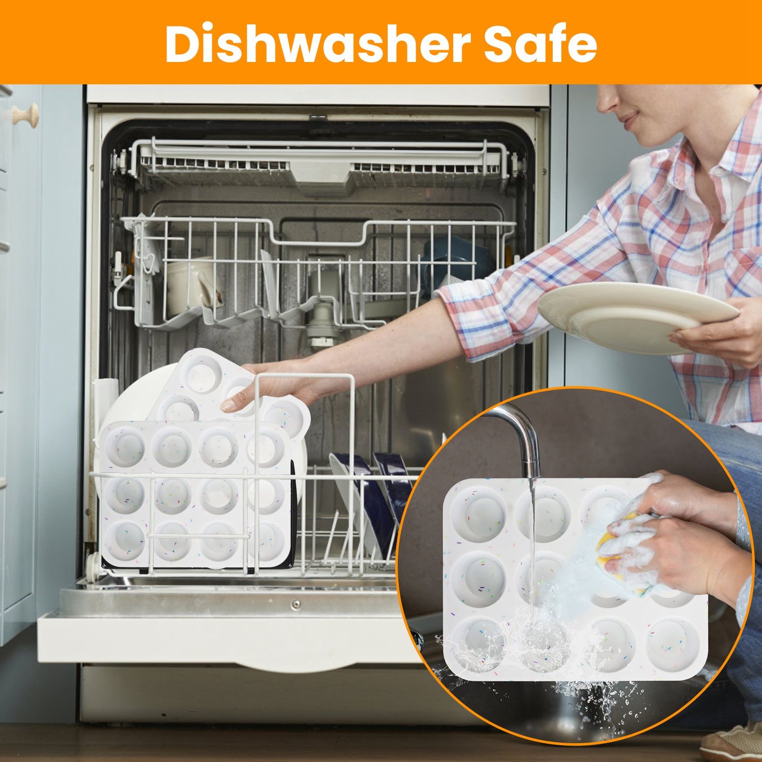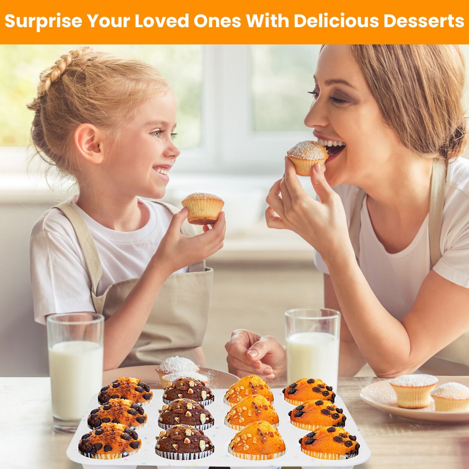 Two flexible silicone muffin pans (12 cups each) for standard cupcakes. Easy-release, 32°F–248°F heat resistance; oven, microwave, fridge, freezer & dishwasher safe.