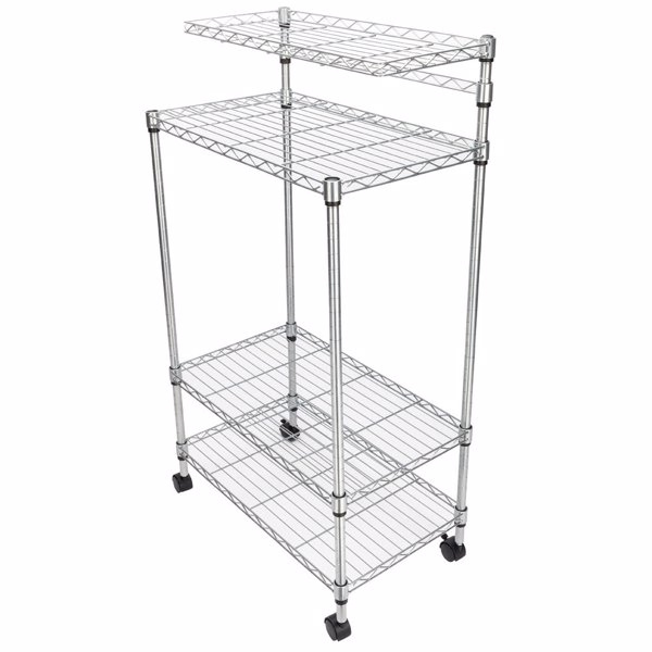 Carbon-steel 4-tier rack with mesh shelves, wheels, and wave rod. Strong anti-rust finish; 60×35×120cm. Space-saving storage for appliances and supplies.