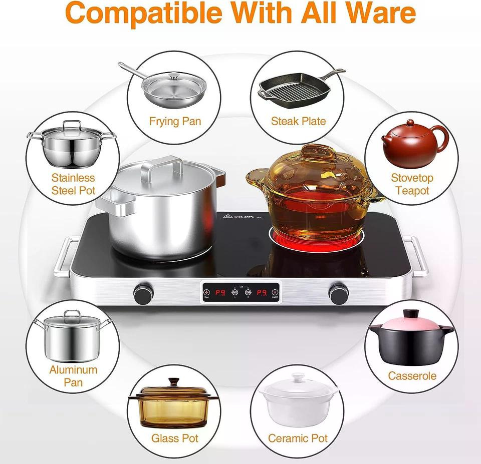 Portable double burner (1100W+1100W) with LED display, child lock, 99-min timer, overheat protection, and easy-clean crystal surface.