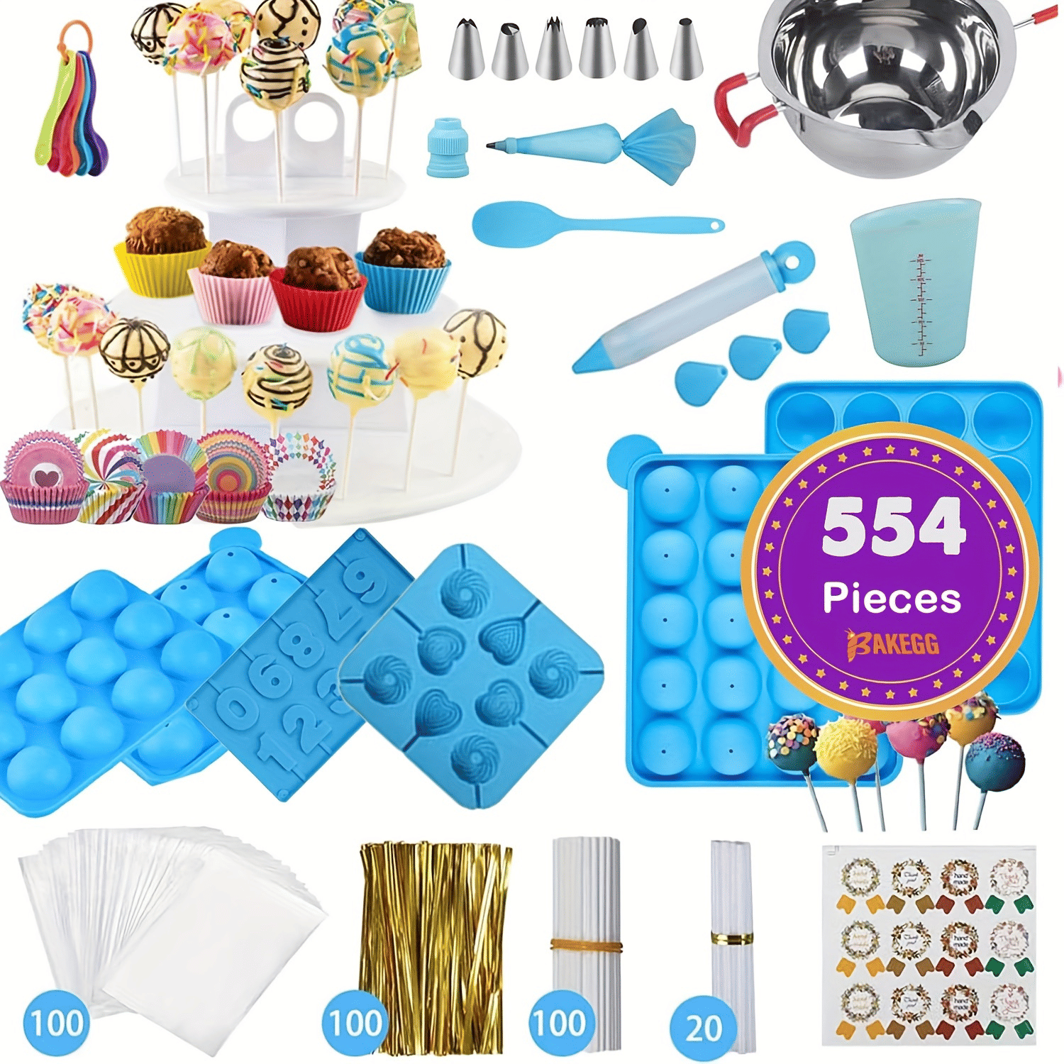 Value-packed 554-piece cake pop kit with silicone molds, melting pot, decorating pen, sticks, wrappers, and 3-tier display stand—kid-friendly and beginner-ready.