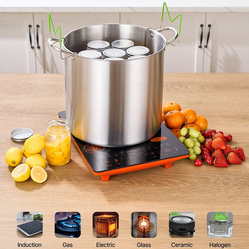 Corrosion-resistant canning pot with rack and lid; thickened bottom works on induction, gas, ceramic, and more. Handles up to 7 jars—easy-clean matte finish.