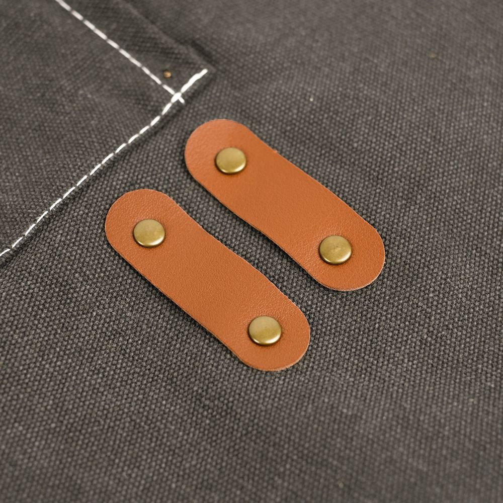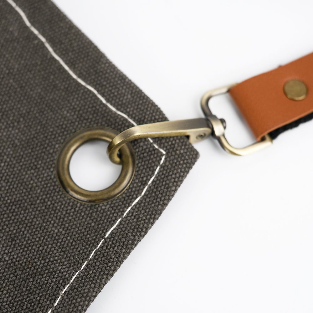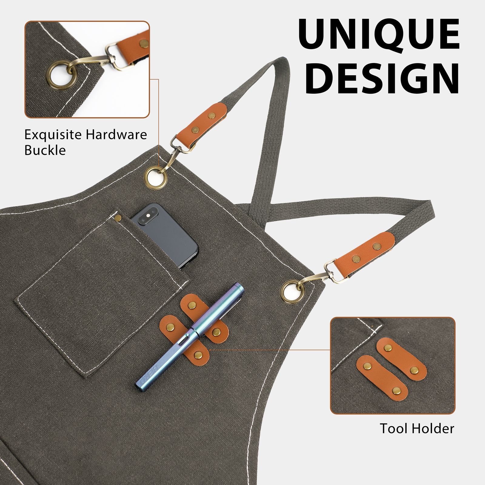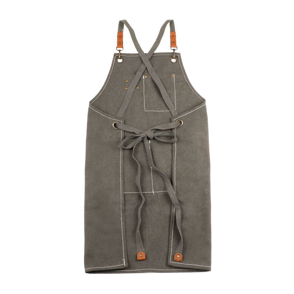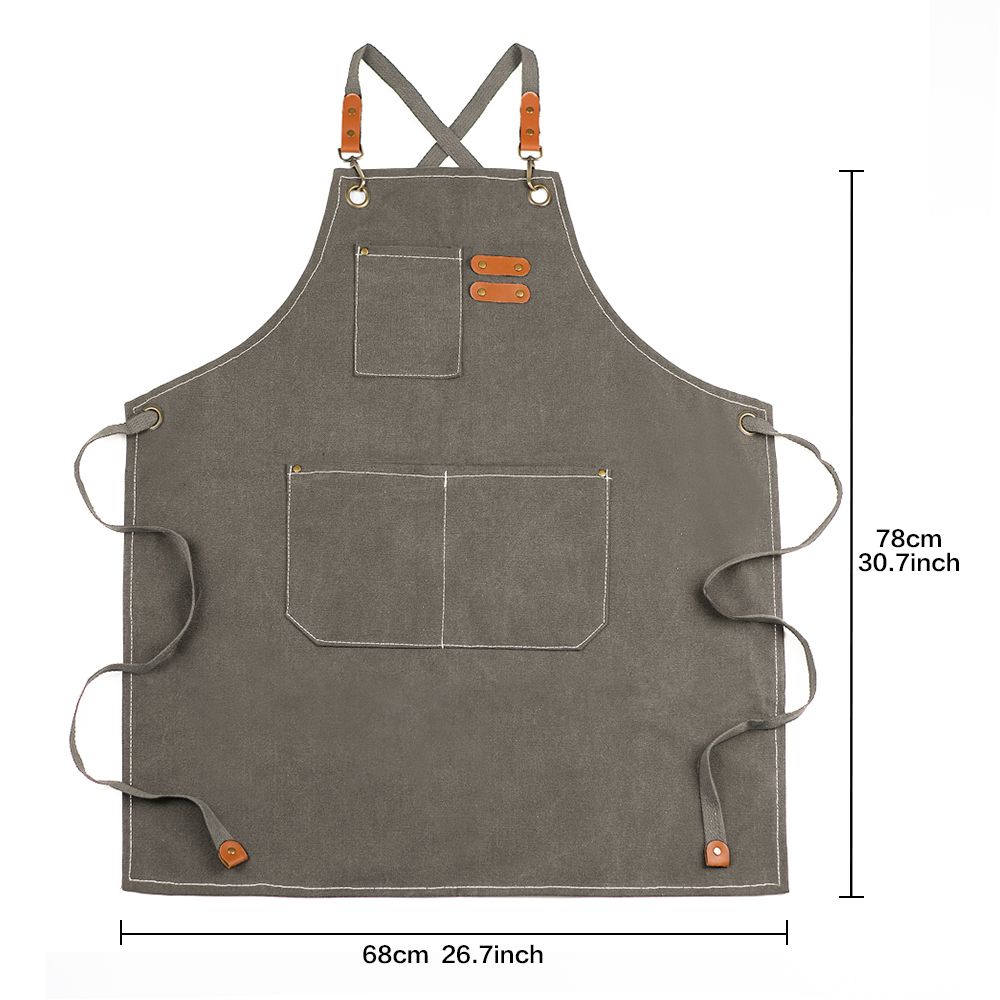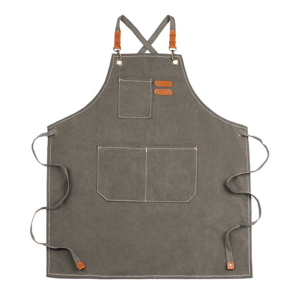 Cross-back cotton canvas apron with reinforced pockets and metal rivets. Adjustable from M to XXL for kitchen, coffee, shop, garden, and craft work.